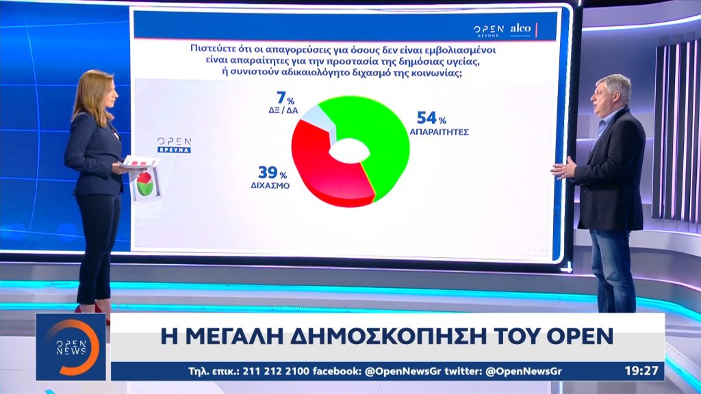 Το 54% θεωρεί ότι οι απαγορεύσεις για όσους δεν είναι εμβολιασμένοι είναι απαραίτητες για την προστασία της δημόσιας υγείας και το 39% ότι συνιστούν αδικαιολόγητο διχασμό της κοινωνίας, όπως έδειξαν τα ευρήματα της νέας μεγάλης δημοσκόπησης του κεντρικού δελτίου ειδήσεων του OPEN. Το 7% στην ίδια ερώτηση απάντησε «Δεν ξέρω/Δεν απαντώ».