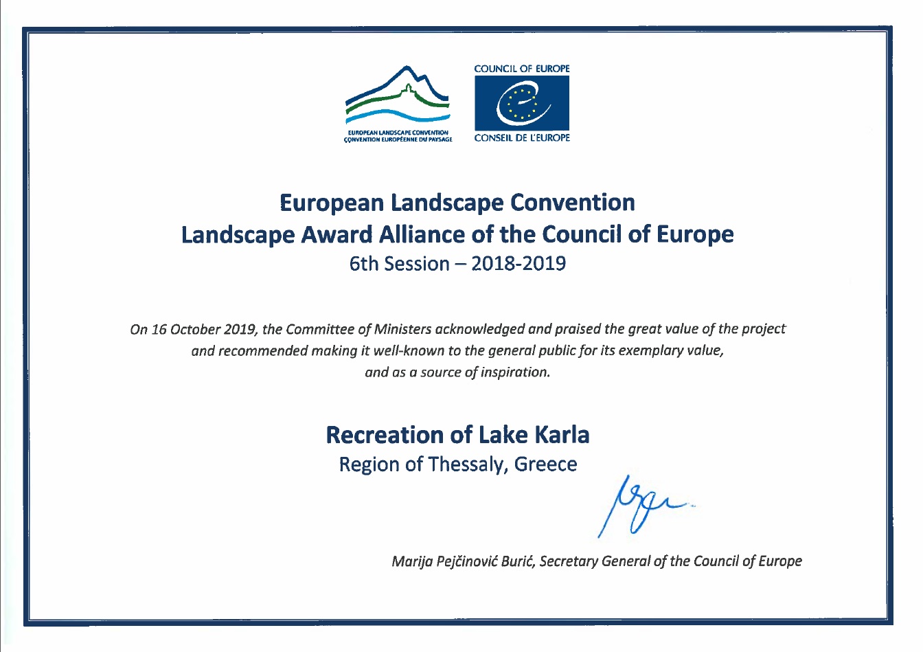 Με το διακεκριμένο Βραβείο Αρχιτεκτονικής Τοπίου του Συμβουλίου της Ευρώπης, (European Diploma) τιμήθηκε η Περιφέρεια Θεσσαλίας για το έργο της ανασύστασης της λίμνης Κάρλα. Το διεθνές βραβείο του Συμβουλίου της Ευρώπης, απονέμεται σε αναγνώριση «της υποδειγματικής διαχείρισης φυσικών περιοχών και τοπίων εξαιρετικής ευρωπαϊκής σημασίας για τη διατήρηση της βιολογικής, γεωλογικής και τοπικής ποικιλομορφίας». Η ανασύσταση της Κάρλας ήταν η εθνική συμμετοχή, που επιλέχτηκε από το Υπουργείο Περιβάλλοντος και Ενέργειας μετά από διαγωνισμό ειδικής επιστημονικής επιτροπής και εκπροσώπησε την Ελλάδα στην 6η Σύνοδο Βραβείου Τοπίου του Συμβουλίου της Ευρώπης. Πρόκειται για μια ακόμη σημαντική διάκριση που έρχεται να προστεθεί στις βραβεύσεις που έχει αποσπάσει η Περιφέρεια Θεσσαλίας για το μεγαλύτερο περιβαλλοντικό έργο που έχει υλοποιηθεί τις τελευταίες δεκαετίες στα Βαλκάνια και την Νοτιοανατολική Ευρώπη.