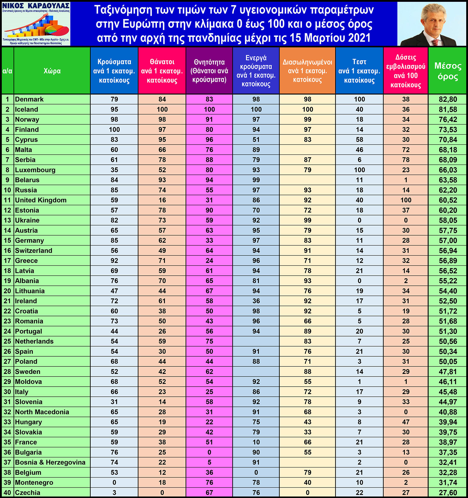 Στην παρούσα μελέτη γίνεται μία προσπάθεια βαθμολογίας της συνολικής διαχείρισης της πανδημίας των ευρωπαϊκών χωρών όσον αφορά την υγεία, λαμβάνοντας υπόψη επτά παραμέτρους από επίσημα στοιχεία των παγκόσμιων εφαρμογών Wordmeter και Ourworldindata, από την αρχή της πανδημίας μέχρι τις 15 Μαρτίου 2021, σχεδόν ένα χρόνο μετά.