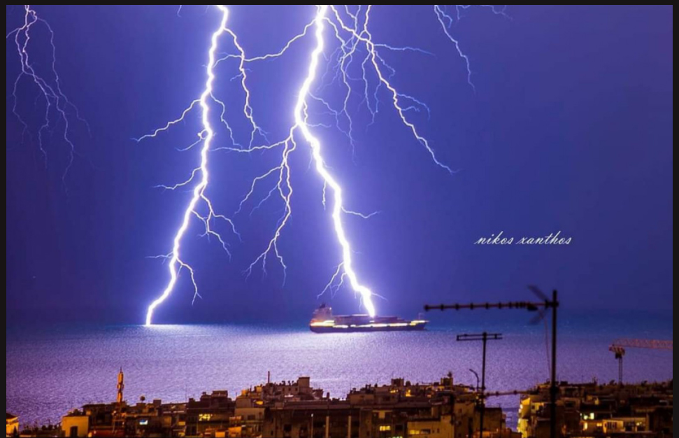 Ο φωτογραφικός φακός αιχμαλώτισε το καρέ στο οποίο αποτυπώνεται ένα κεραυνός να χτυπά τα νερά του Θερμαϊκού και ένα πλοίο που βρισκόταν αρόδο. Η αστραπή μοιάζει κυριολεκτικά να «σκίζει» τη θάλασσα στα δύο, σε μία αναμφισβήτητη εντυπωσιακή εικόνα.