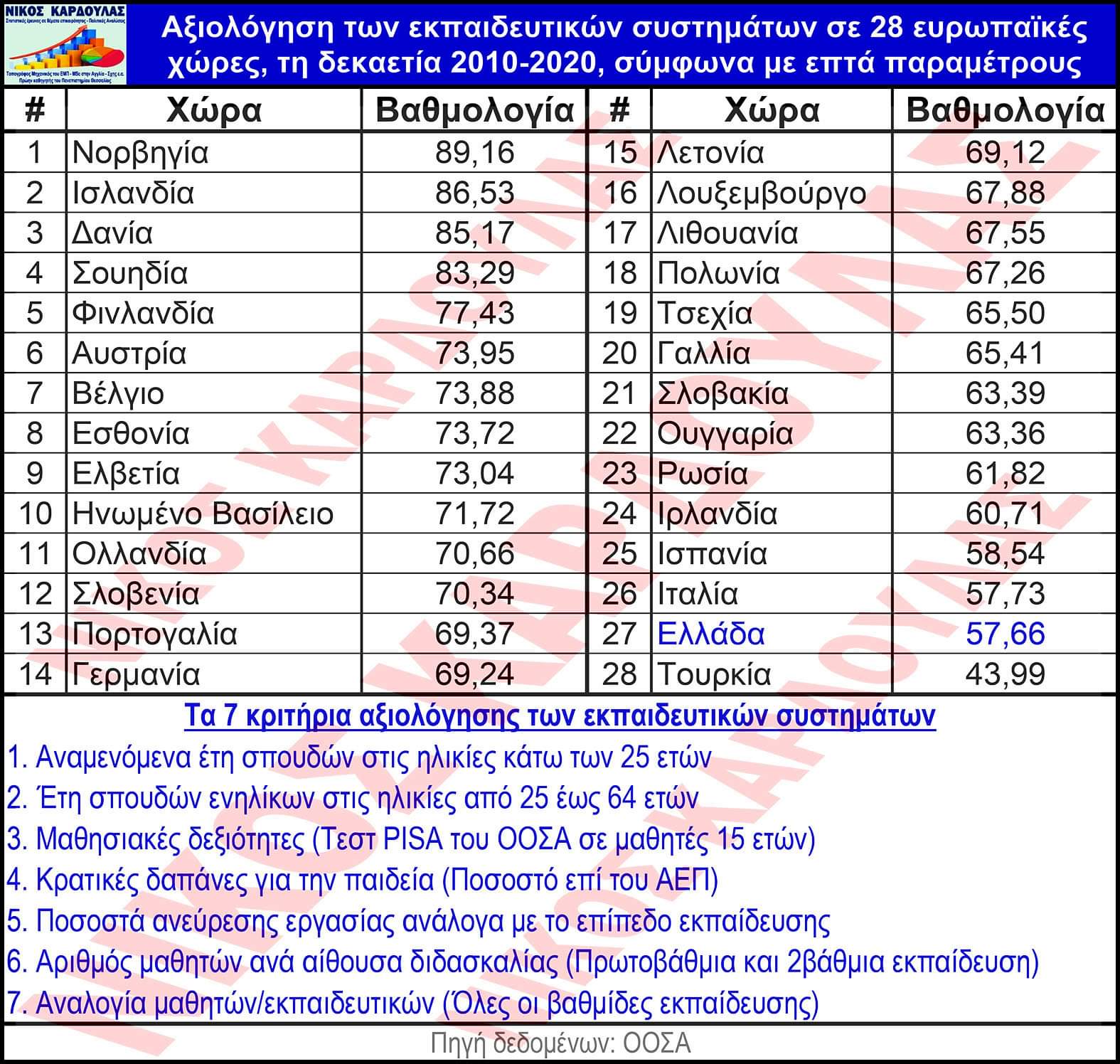 Σύμφωνα με στοιχεία του ΟΟΣΑ, έγινε αξιολόγηση των εκπαιδευτικών συστημάτων σε 28 ευρωπαϊκές χώρες για τις οποίες υπήρχαν διαθέσιμα στοιχεία, τη δεκαετία 2010-2020, λαμβάνοντας υπόψη 7 παραμέτρους.