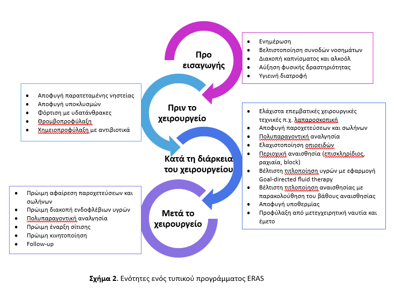 Το πρωτόκολλο ERAS περιλαμβάνει μια σειρά από παρεμβάσεις κατά την προεγχειρητική, διεγχειρητική και μετεγχειρητική περίοδο, οι οποίες βασίζονται στην αποδεικτική ιατρική και αποσκοπούν στην ελαχιστοποίηση του χειρουργικού stress (Σχήμα 2).
