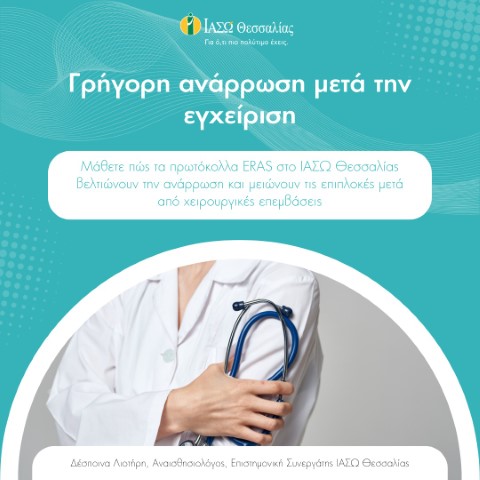 Οι ασθενείς του ΙΑΣΩ Θεσσαλίας έχουν επιλογή. Όσα πρέπει να γνωρίζετε για τα πρωτόκολλα ενισχυμένης μετεγχειρητικής ανάρρωσης Enhanced Recovery After Surgery (ERAS). Τα τελευταία χρόνια παρατηρείται διεθνώς μια στροφή σε πιο μοντέρνες θεραπευτικές προσεγγίσεις όσον αφορά την περιεγχειρητική διαχείριση του ασθενούς με στόχο την ταχεία και ποιοτική ανάρρωση χωρίς επιπλοκές. Και αυτό επιτυγχάνεται με μια σειρά παρεμβάσεων που αποσκοπούν στην ελαχιστοποίηση του χειρουργικού stress.