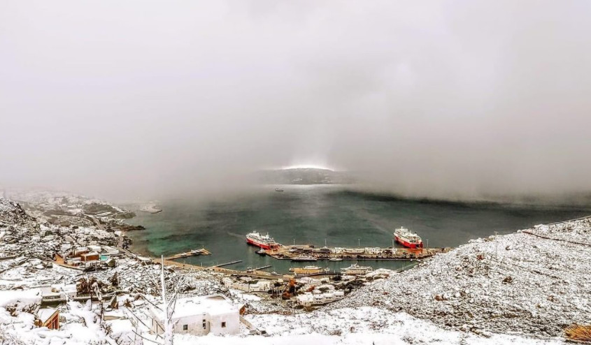 Πλέον το τοπίο σε Σύρο, Τήνο, Νάξο, Αμοργό και Μύκονο είναι κατάλευκο με τα λευκά σπιτάκια να ξεχωρίζουν μετά βίας από το χιονισμένο τοπίο.