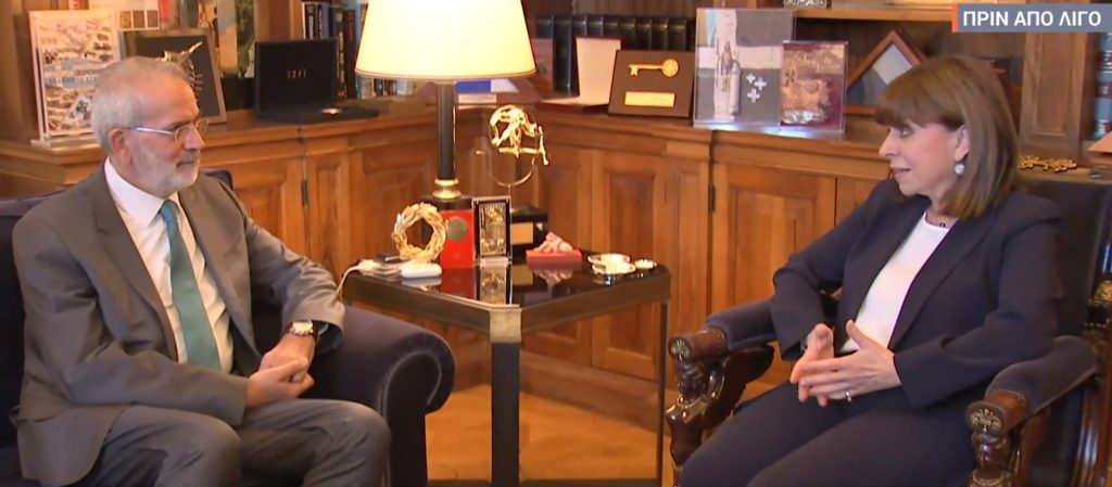 Στον διάλογο που είχαν, η Κ. Σακελλαροπούλου καλωσόρισε τον κ. Σαρμά λέγοντάς του: «Σας κάλεσα γιατί, όπως γνωρίζετε, στο σημερινό συμβούλιο των πολιτικών αρχηγών διαπιστώθηκε και τυπικά μη δυνατότητα σχηματισμού κυβέρνησης, όπως προβλέπει το άρθρο 37, και έτσι φτάσαμε στην τελευταία λύση του Συντάγματος για υπηρεσιακή κυβέρνηση».