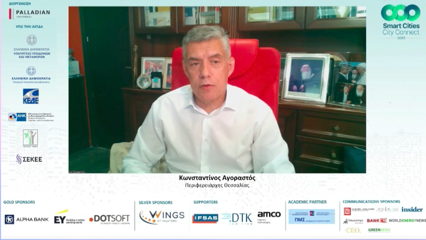 Τον στρατηγικό σχεδιασμό, τα έργα και τις δράσεις που υλοποιεί η Περιφέρεια Θεσσαλίας στο πλαίσιο του ψηφιακού μετασχηματισμού και της μετεξέλιξής της σε «ευφυή» Περιφέρεια παρουσίασε ο Περιφερειάρχης Θεσσαλίας Κώστας Αγοραστός στην ομιλία του στο υβριδικό Συνέδριο Smart Cities – City Connect Conference & Expo 2022.