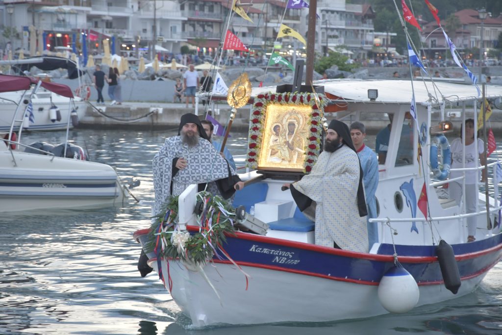 Η Ιερά Εικόνα κατέφθασε με ειδικό πλοιάριο, συνοδευόμενο και από άλλα πλωτά μέσα και αλιευτικά σκάφη. Την υποδέχθηκε ο Μητροπολίτης Κίτρους, Κατερίνης και Πλαταμώνος Γεώργιος συμπαραστατούμενος απο κληρικούς της Ιεράς Μητροπόλεως.