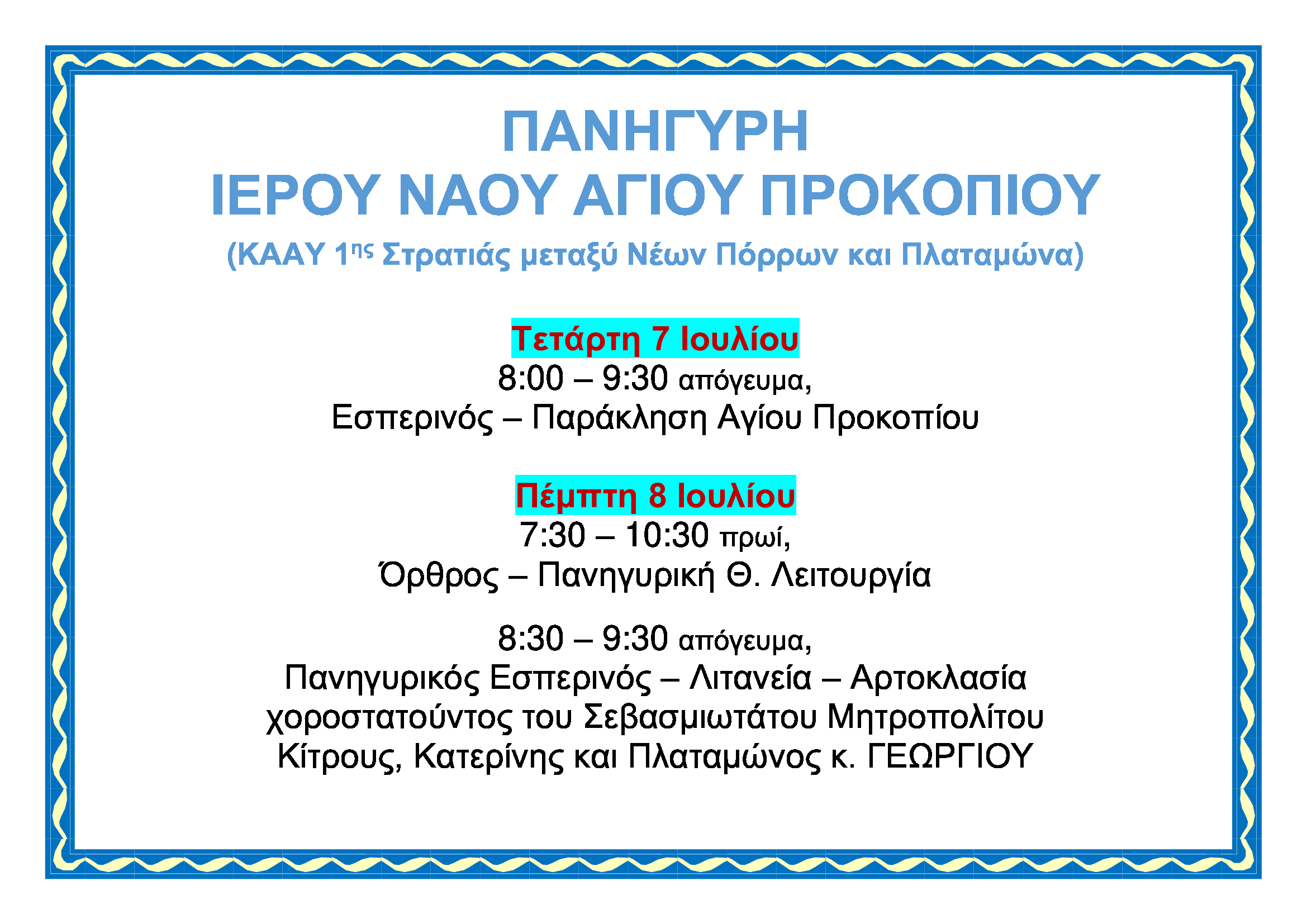 Πανηγυρίζει ο Ναός Αγίου Προκοπίου στα ΚΑΑΥ Πλαταμώνα Βασίλης Αλεξίου 4 έτη ago Πανηγυρίζει ο Ναός Αγίου Προκοπίου στα ΚΑΑΥ Πλαταμώνα. Αναλυτικά το πρόγραμμα: