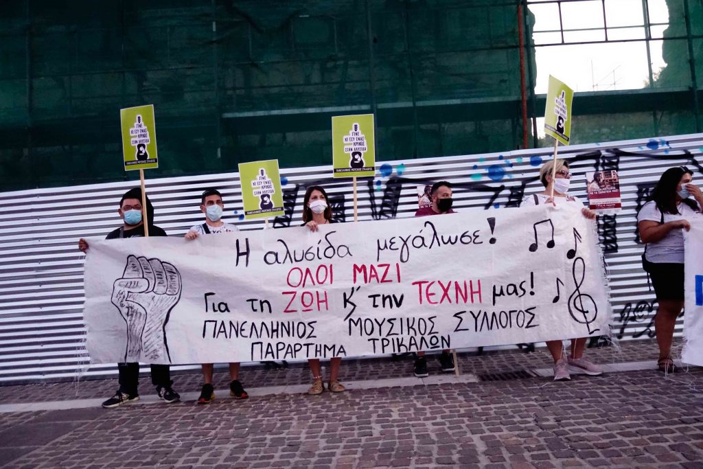 Πραγματοποιήθηκαν αγωνιστικοί χαιρετισμοί από την αντιπροσωπεία της Πανθεσσαλικής Ένωσης επαγγελματιών μουσικών (με έδρα τη Λάρισα), από την προσωρινή Διοίκηση του παραρτήματος Λάρισας του Πανελλήνιου Μουσικού Συλλόγου, τον Κώστα Βλαχούτσο μέλος του ΔΣ του Παν-θεσσαλικού σωματείου επαγγελματικών μουσικών «Απόλλων» (με έδρα τον Βόλο) ενώ ο πρόεδρος του παραρτήματος Τρικάλων Ηλίας Σέγγης στην ομιλία που ετοίμασε τόνισε μεταξύ άλλων : «Εδώ και πέντε μήνες ζούμε σε συνθήκες δύσκολες. Οι περισσότεροι από εμάς έχουμε να δουλέψουμε από πριν την καραντίνα ενώ ελάχιστοι κατάφεραν να κάνουν μόνο ένα, δύο μεροκάματα. Σε αυτή τη δύσκολη περίοδο φάνηκε ξεκάθαρα πως η κυβέρνηση ενδιαφέρεται μόνο για τα κέρδη των μεγάλων επιχειρηματικών ομίλων και όχι για τους εργαζόμενους. (…) Μόνο με την πίεσή μας καταφέραμε μια σειρά πράγματα, διεύρυνση των επιδομάτων σε περισσότερους κλπ. (…). Μετά την σημερινή κινητοποίηση θέλουμε να εντείνουμε την συζήτηση (…) Δυναμώνουμε λοιπόν τον αγώνα μας! Παλεύουμε για την επιβίωσή μας. Παλεύουμε για την Τέχνη μας! Καλή δύναμη!»