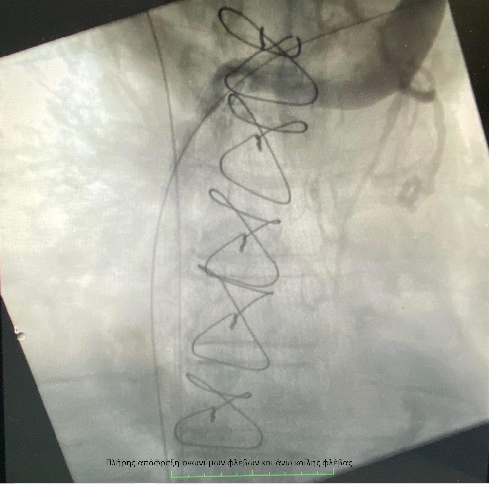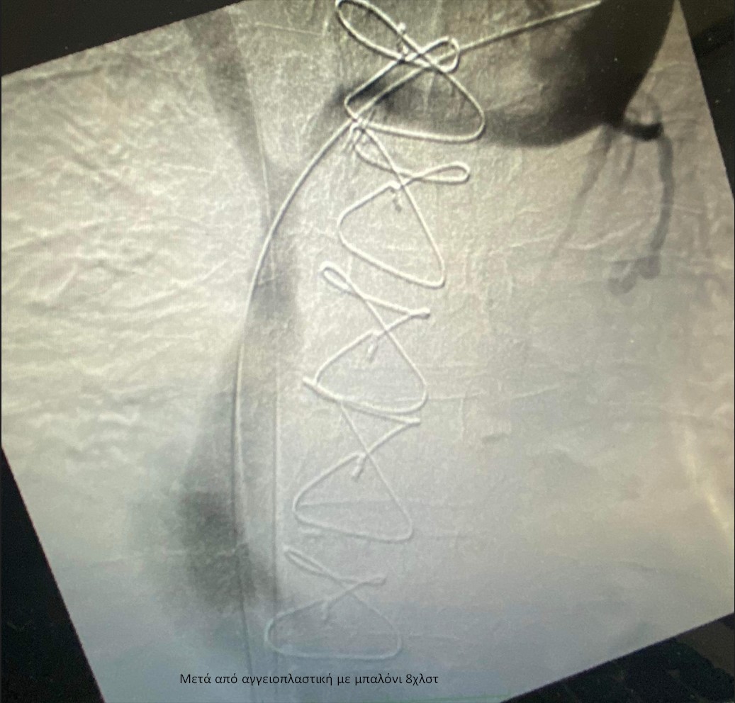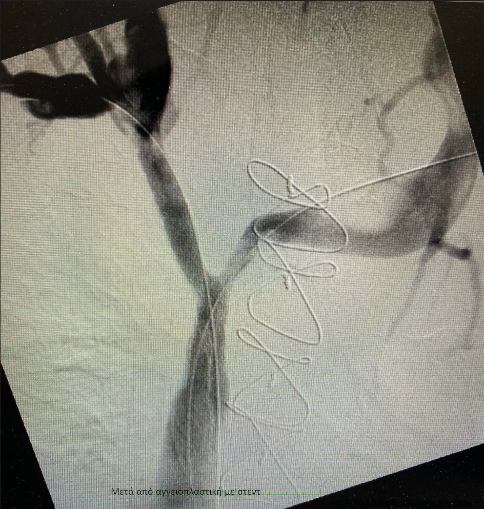 Η ομάδα της Α´ Αγγειοχειρουργικής κλινικής υπό την καθοδήγηση του Διευθυντή Αγγειοχειρουργού Νεκτάριου Γαλάνη και την πολύτιμη συνδρομή του Ακτινολόγου Βασίλειου Δημαρέλου και του Αναισθησιολόγου Δημήτριου Ζωσιμίδη, προχώρησε σε αγγειοπλαστική των πλέον στενωτικών σημείων των ανώνυμων φλεβών και της άνω κοίλης φλέβας υπό ακτινοσκοπική καθοδήγηση. Η προσπέλαση ήταν διπλή με παρακέντηση των μασχαλιαίων φλεβών αμφότερων των άνω άκρων και τοποθέτηση δίδυμων στεντ εύρους 12χλστ και μήκους 80χλστ στη δεξιά και αριστερή ανώνυμη φλέβα και την άνω κοίλη φλέβα, που αποκατέστησαν τη βατότητα των ανωτέρω αγγείων.