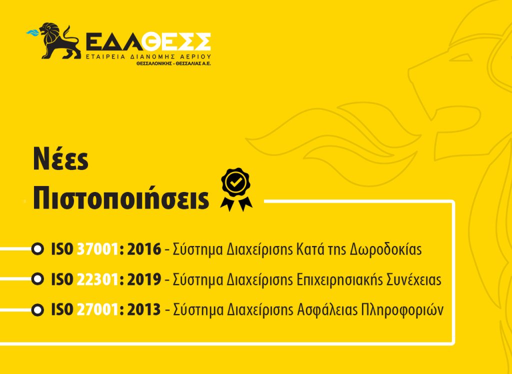Αξίζει να σημειωθεί ότι με γνώμονα την προστασία των Πληροφοριών, των Πληροφοριακών Πόρων και των επιχειρησιακών της λειτουργιών, και δη στο πλαίσιο των αυξημένων απαιτήσεων τηλεργασίας, η ΕΔΑ ΘΕΣΣ αναγνώρισε πρόσθετα την ανάγκη θέσπισης και θεμελίωσης ενός Συστήματος Διαχείρισης Ασφαλείας Πληροφοριών για τη βελτιστοποίηση της διαχείρισης των πληροφοριακών κινδύνων, βάσει διεθνών προτύπων και βέλτιστων πρακτικών. Το σύστημα αυτό έχει πιστοποιηθεί σύμφωνα με το πρότυπο ISO 27001: 2013 και καθιερώνει το πλαίσιο για την έγκαιρη και αποτελεσματική αναγνώριση, αξιολόγηση και επίλυση, Περιστατικών Ασφάλειας.