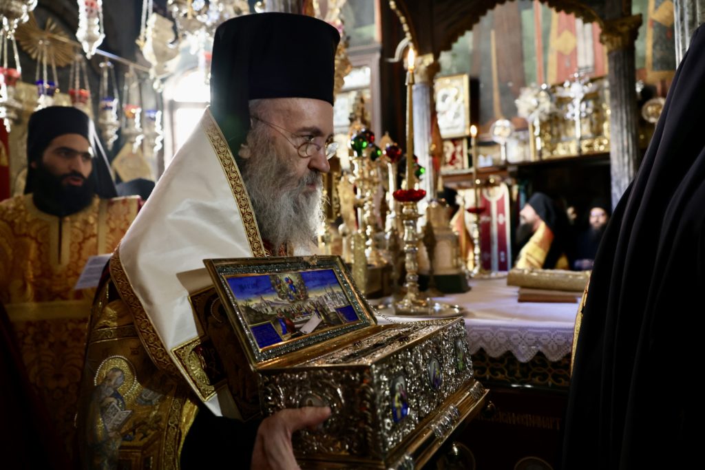 Η Αγία Ζώνη τοποθετήθηκε στο κέντρο του Καθολικού προς προσκύνηση και αγιασμό των πατέρων και των πιστών που προσήλθαν στην Μονή για την πανήγυρη.