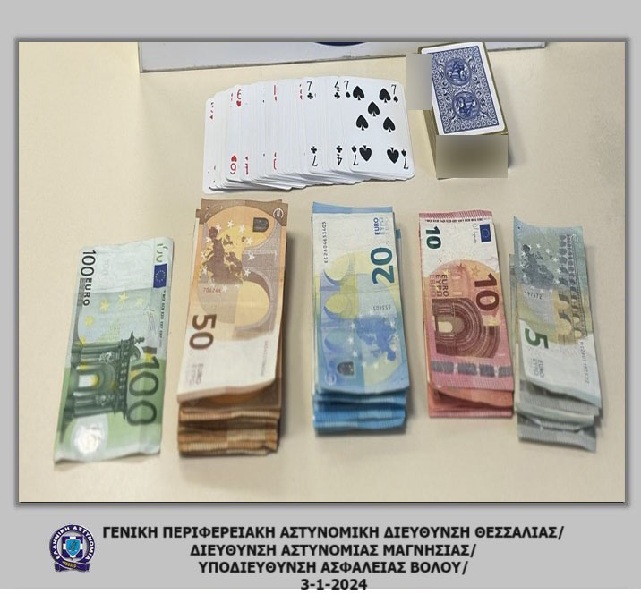 Συνελήφθησαν, σήμερα (03-01-2024) τις μεταμεσονύχτιες ώρες στον Βόλο, από αστυνομικούς της Υποδιεύθυνσης Ασφάλειας Βόλου, -4- ημεδαποί άνδρες, σε βάρος των οποίων σχηματίσθηκε δικογραφία για παράβαση της νομοθεσίας περί παιγνίων.