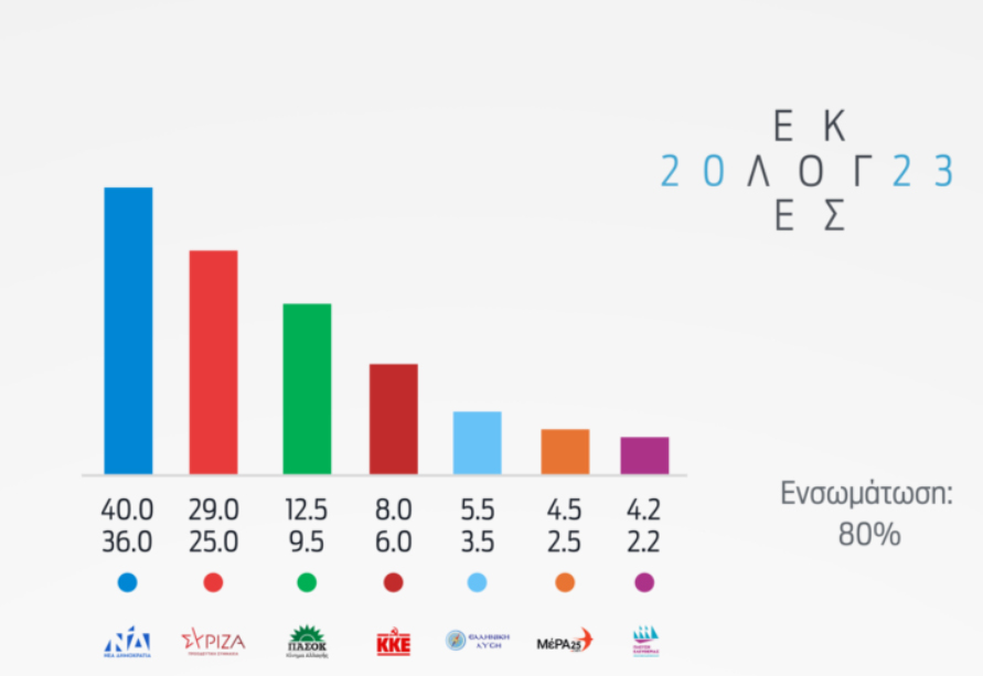 Σύμφωνα με το τελικό exit poll, η ΝΔ αναμένεται να λάβει από 37,5% έως 41,5% και ο ΣΥΡΙΖΑ-ΠΣ από 23,5% έως 27,5%. To ΠΑΣΟΚ συγκεντρώνει 11,5% – 12,5%, το ΚΚΕ 6,5% – 7,5%, η Ελληνική Λύση 4,3% – 5,3%, το ΜέΡΑ25 2,5% – 3,5% και η Πλεύση Ελευθερίας 2,5% – 3,5%.
