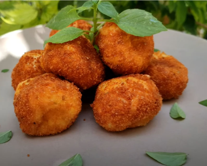 • Πλάθουμε μπαλάκια μικρού μεγέθους, τα περνάμε από φρυγανιά, και τα τηγανίζουμε σε καυτό λάδι.