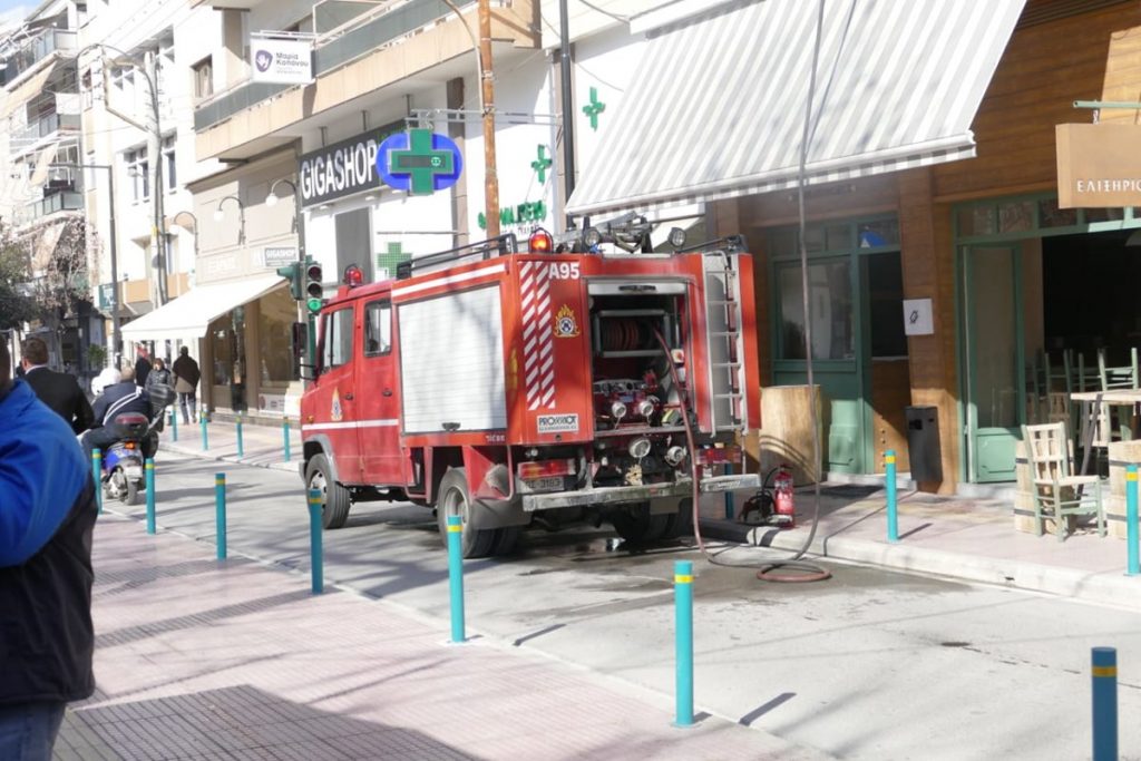 Νωρίτερα το πρωί της Πέμπτης, η πυρκαγιά ξεκίνησε μέσα στην καμινάδα στο ψητοπωλείο – σουβλατζίδιο «Ελιξήριο» επί της οδού Μανδηλαρά.