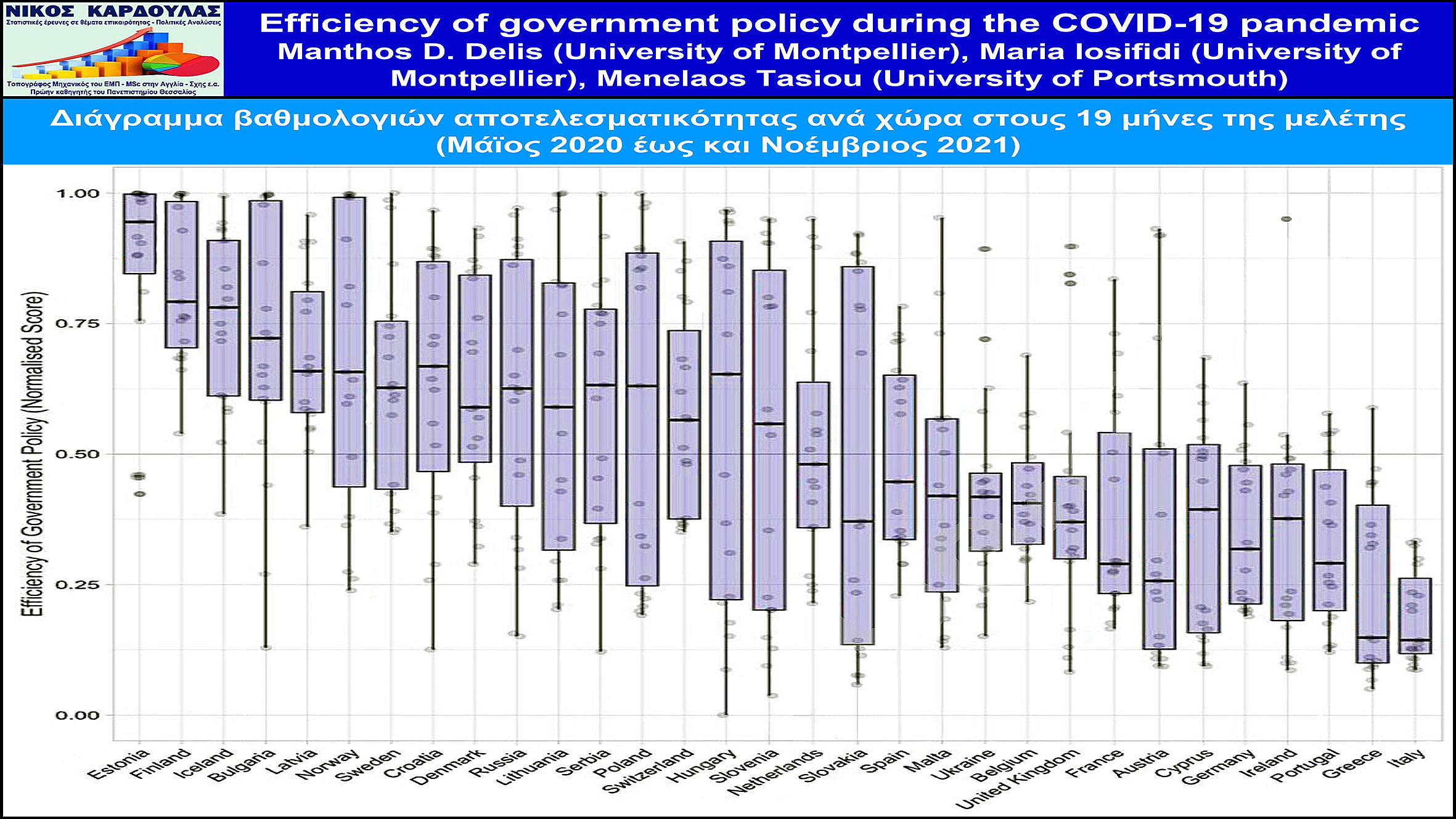 Σε μελέτη των Μάνθου Δελή, Μαρίας Ιωσηφίδη και Mενέλαου Τάσιου με τίτλο «Efficiency of government policy during the COVID-19 pandemic», που δημοσιεύθηκε στο SSRN (Social Science Research Network), εξετάσθηκε η αποτελεσματικότητα των κυβερνητικών πολιτικών όσον αφορά κυρίως στην πρόληψη θανάτων και όχι η αποτελεσματικότητα σε άλλες κοινωνικές ή οικονομικές διαστάσεις. Στη μελέτη υπολογίσθηκε για πρώτη φορά ο δείκτης αποτελεσματικότητας των κυβερνητικών πολιτικών κατά τη διάρκεια της πανδημίας σε 81 χώρες παγκοσμίως, συγκρίνοντας τον «Δείκτη περιορισμών και υγείας» για τον Covid-19 του πανεπιστημίου της Οξφόρδης (13 παράμετροι που αντικατοπτρίζουν τις πολιτικές περιορισμού, κλεισίματος και του συστήματος υγείας) με τους θανάτους λόγω Covid-19, σε κάθε χώρα και για κάθε μήνα για τους 19 μήνες από τον Μάιο του 2020 έως και τον Νοέμβριο του 2021.