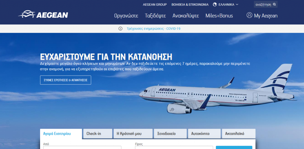 Συγκεκριμένα η AEGEAN δίνει τη δυνατότητα σε όλα τα εισιτήρια που έχουν εκδοθεί και θα εκδοθούν μέχρι και τις 30 Απριλίου με ημερομηνία ταξιδιού έως και τις 20 Οκτωβρίου, μ να αλλαχθούν online μέσω του website μας (aegeanair.com, olympicair.com) στην ενότητα Η Κράτησή μου, χωρίς χρέωση αλλαγής.