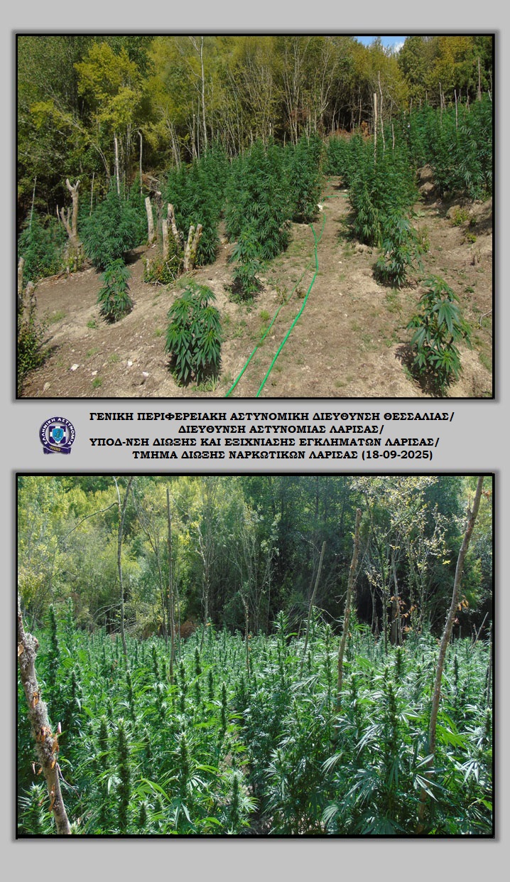 Εντοπίστηκε, από αστυνομικούς του Τμήματος Δίωξης Ναρκωτικών της Υποδιεύθυνσης Δίωξης και Εξιχνίασης Εγκλημάτων Λάρισας, σύμπλεγμα φυτειών όπου καλλιεργούνταν μεγάλος αριθμός δενδρυλλίων κάνναβης σε ορεινή και δασώδη περιοχή του Ολύμπου, στην Περιφερειακή Ενότητα Λάρισας.
