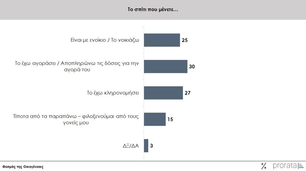 O 1 στους 4 μένει σε ενοίκιο, ενώ το 57% είναι ιδιοκτήτες του σπιτιού τους είτε από κληρηνομιά είτε από αγορά με δάνειο. Το 15% φιλοξενείται από τους γονείς του.