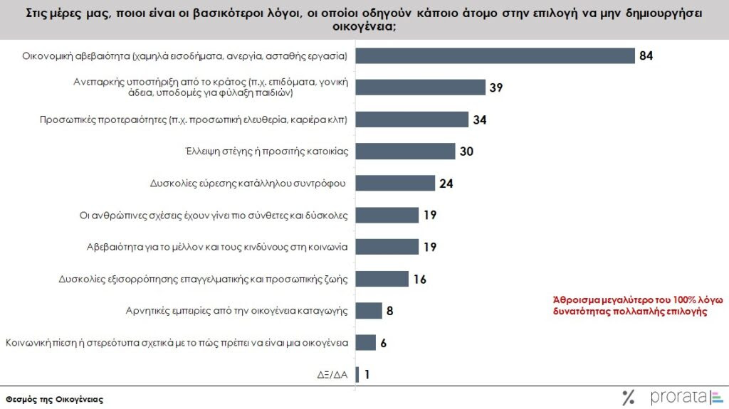 Στους βασικότερους λόγους που δεν μπορούν οι Έλληνες να προχωρήσουν στη δημιουργία οικογένειας αναφέρονται η οικονομική αβεβαιότητα (84%) η ανεπαρκής στήριξη του κράτους (39%) και οι προσωπικές προτεραιότητες (34%).