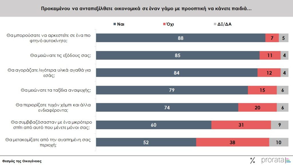 Ενδεικτικά, το 88% θα αρκούνταν σε φτηνότερο αυτοκίνητο, το 85% θα μείωνε τις εξόδους και τη διασκέδαση και ένα 84% θα συμβιβαζόταν με λιγότερα αγαθά για τους ίδιους προκειμένου να εξασφαλίσουν τον έγγαμο και γονικό βίο.