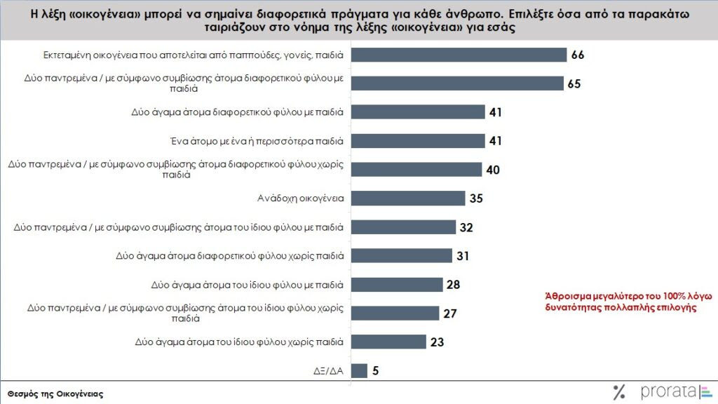 Για το 66% των ερωτηθέντων, οικογένεια είναι το παραδοσιακό πρότυπο με παππούδες, γονείς, παιδιά. Ωστόσο, ένα ίδιο ποσοστό 65% θεωρεί ως οικογένεια ακόμα και άτομα που μένουν με σύμφωνο συμβίωσης ή παντρεμένα που έχουν παιδιά.