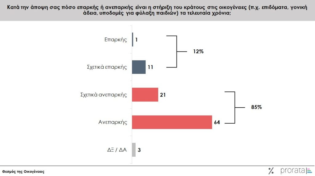 Ένα συντριπτικό ποσοστό των ερωτηθέντων (85%) θεωρεί το κράτος ανεπαρκές ως προς τη στήριξη των οικογενειών. Τόσο ο κ. Ζαφείρης όσο και ο κ. Αλεξίου παρατηρούν τις τεράστιες ευθύνες της πολιτείας, όπως καταγράφονται και από τις απαντήσεις των ερωτηθέντων.