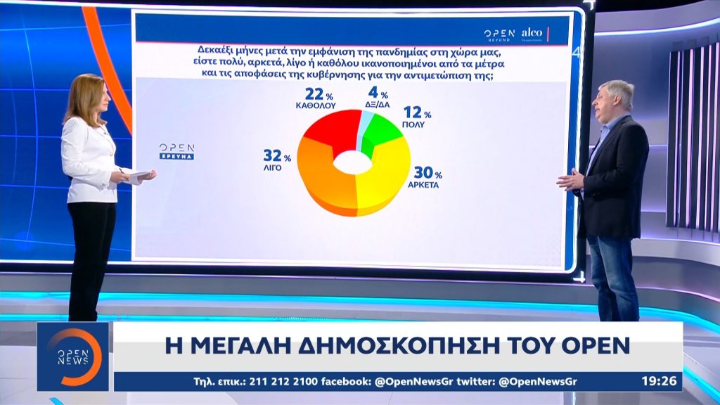 Δυσαρέσκεια εκφράζει η πλειονότητα των πολιτών και για τη διαχείριση της πανδημίας, με το 54% να δηλώνει καθόλου ή λίγο ικανοποιημένο από τα μέτρα της κυβέρνησης. Επιπλέον, το 57% τάσσεται υπέρ του υποχρεωτικού εμβολιασμού για συγκεκριμένες κατηγορίες εργαζομένων, και το 46% λέει «ναι» στην κατάργηση των περιορισμών για τους εμβολιασμένους.