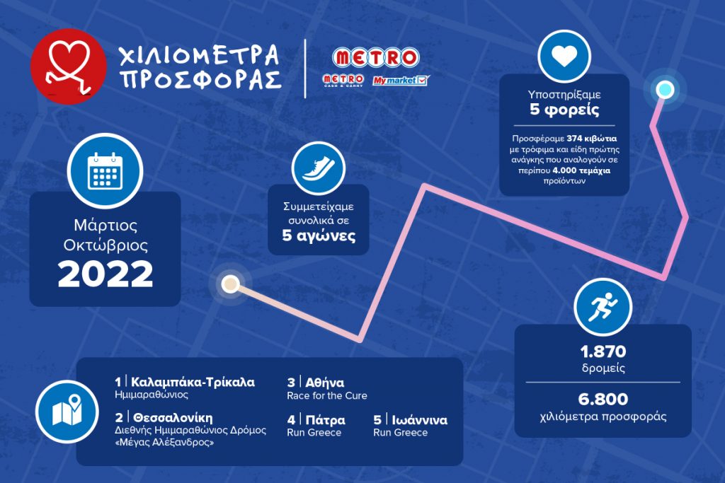 Συνολικά, από το 2017 έως το 2022 οι συμμετοχές της METRO Running Team έχουν ξεπεράσει τις 13.000, από αγώνες δρόμου σε όλη την Ελλάδα, και όλοι μαζί έχουν διανύσει 49.000 «Χιλιόμετρα Προσφοράς», στηρίζοντας με αυτόν τον τρόπο, ιδρύματα και φορείς επιστρέφοντας αξία στις τοπικές κοινωνίες!