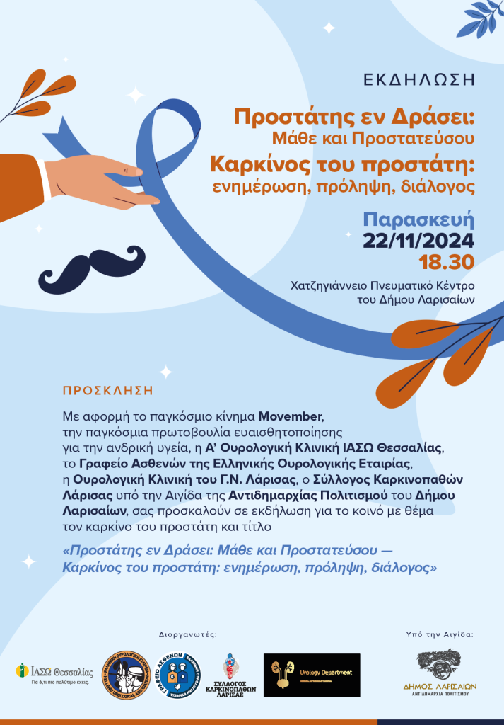 Με αφορμή το παγκόσμιο κίνημα Movember, την παγκόσμια πρωτοβουλία ευαισθητοποίησης για την ανδρική υγεία, η Α Ουρολογική Κλινική ΙΑΣΩ Θεσσαλίας, το Γραφείο Ασθενών της Ελληνικής Ουρολογικής Εταιρίας, η Ουρολογική Κλινική του Γ.Ν. Λάρισας και ο Σύλλογος Καρκινοπαθών Λάρισας, υπό την Αιγίδα της Αντιδημαρχίας Πολιτισμού του Δήμου Λαρισαίων, σας προσκαλούν σε εκδήλωση για το κοινό με θέμα τον καρκίνο του προστάτη και τίτλο: