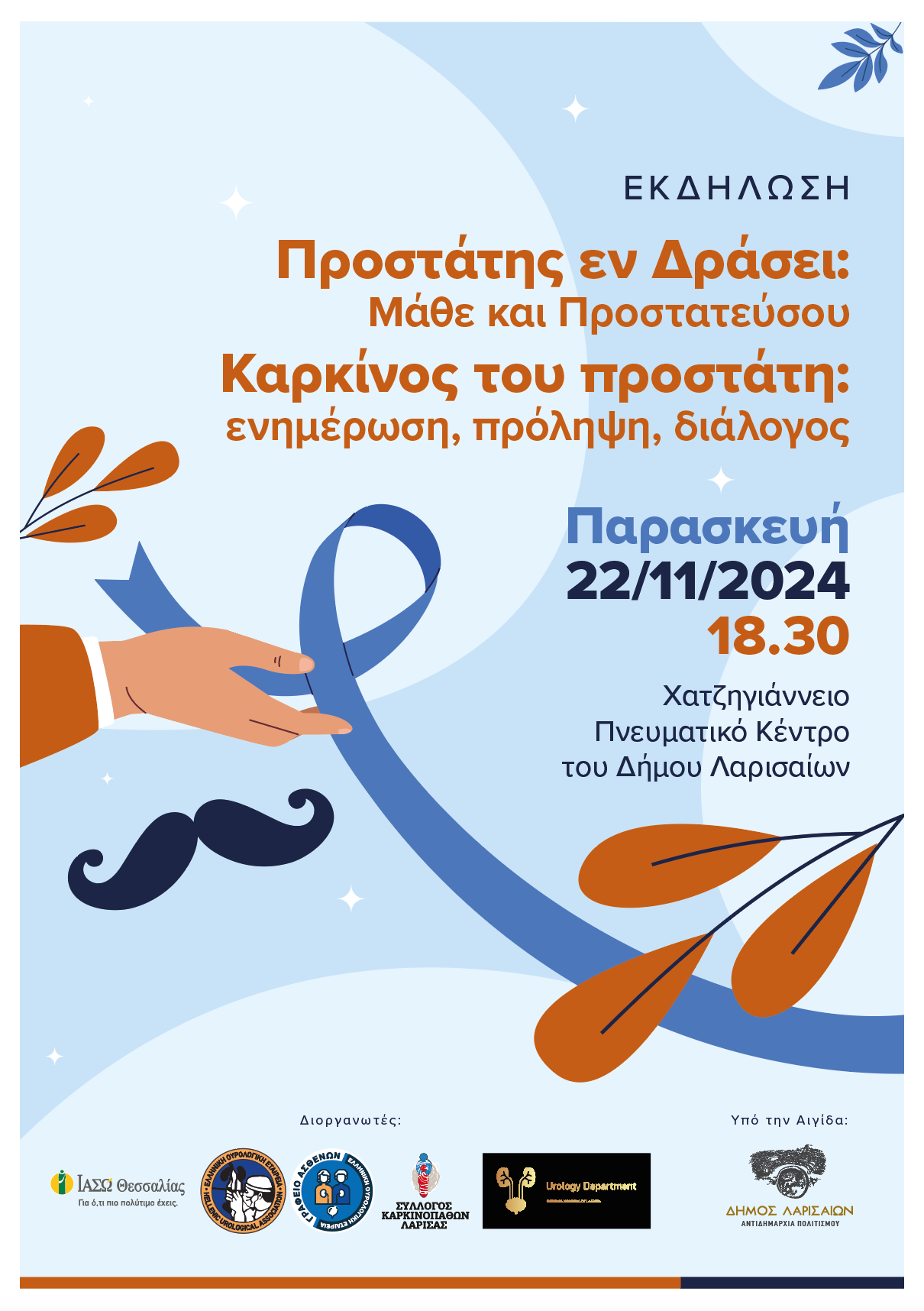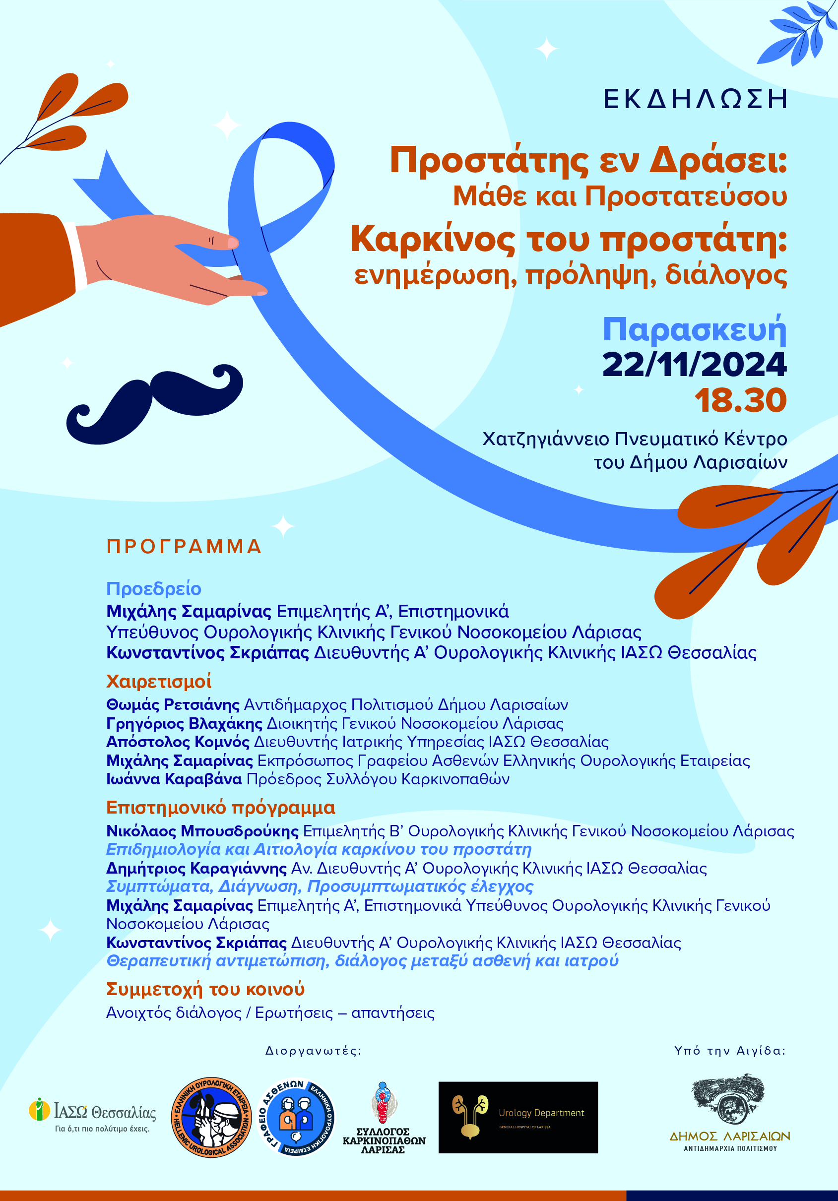 Με αφορμή το παγκόσμιο κίνημα Movember, την παγκόσμια πρωτοβουλία ευαισθητοποίησης για την ανδρική υγεία, η Α Ουρολογική Κλινική ΙΑΣΩ Θεσσαλίας, το Γραφείο Ασθενών της Ελληνικής Ουρολογικής Εταιρίας, η Ουρολογική Κλινική του Γ.Ν. Λάρισας και ο Σύλλογος Καρκινοπαθών Λάρισας, υπό την Αιγίδα της Αντιδημαρχίας Πολιτισμού του Δήμου Λαρισαίων, σας προσκαλούν σε εκδήλωση για το κοινό με θέμα τον καρκίνο του προστάτη και τίτλο: