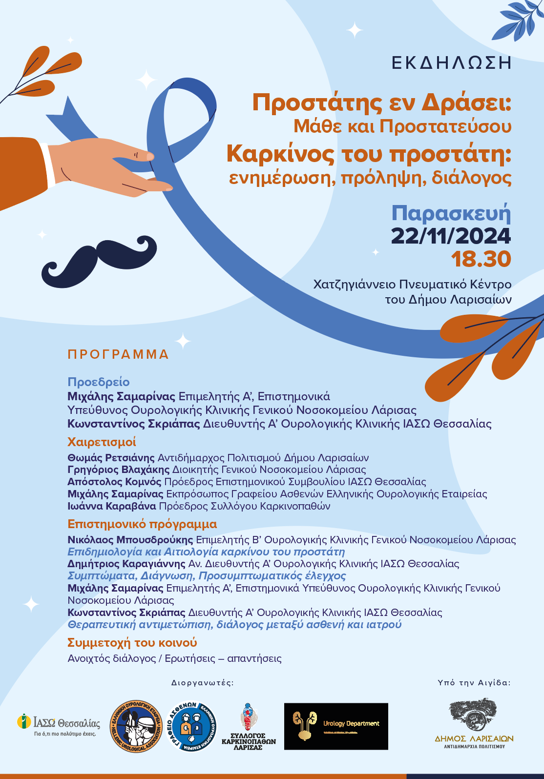 Με αφορμή το παγκόσμιο κίνημα Movember, την παγκόσμια πρωτοβουλία ευαισθητοποίησης για την ανδρική υγεία, η Α Ουρολογική Κλινική ΙΑΣΩ Θεσσαλίας, το Γραφείο Ασθενών της Ελληνικής Ουρολογικής Εταιρίας, η Ουρολογική Κλινική του Γ.Ν. Λάρισας και ο Σύλλογος Καρκινοπαθών Λάρισας, υπό την Αιγίδα της Αντιδημαρχίας Πολιτισμού του Δήμου Λαρισαίων, σας προσκαλούν σε εκδήλωση για το κοινό με θέμα τον καρκίνο του προστάτη και τίτλο: