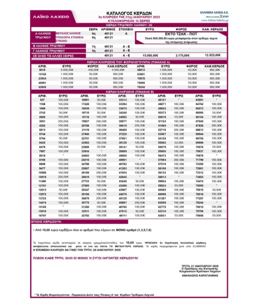 O πίνακας κερδών του Λαϊκού Λαχείου – Κλήρωση 21/1/2025