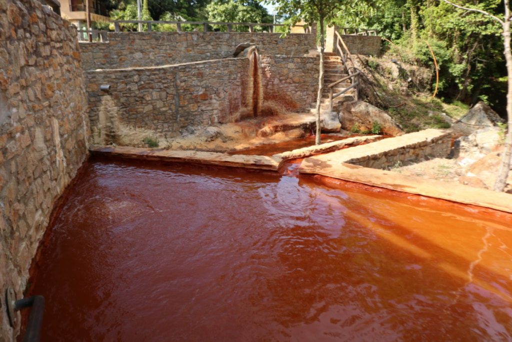 Το νερό αναβλύζει από τα σπλάχνα του Κισσάβου και χαρακτηρίζεται από την υψηλή περιεκτικότητά του σε σίδηρο. Ο σίδηρος βάφει τις πέτρες και το έδαφος με κόκκινη απόχρωση, χαρίζοντας στην περιοχή το χαρακτηριστικό της όνομα. Πρόκειται για ψυχρό ιαματικό νερό, με θερμοκρασία γύρω στους 17°C, ιδανικό για ποσιθεραπεία αλλά και για δροσερά λουτρά.