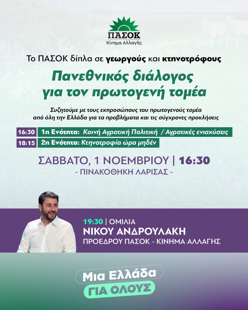 Όπως καταγράφει το trikalavoice.gr θα διεξαχθεί ο «Πανεθνικός διάλογος για τους αγρότες», σε μια κρίσιμη χρονική συγκυρία, καθώς τα προβλήματα για τον πρωτογενή τομέα γιγαντώνονται. Θα μιλήσει ο ίδιος ο πρόεδρος του κόμματος Νίκος Ανδρουλάκης.