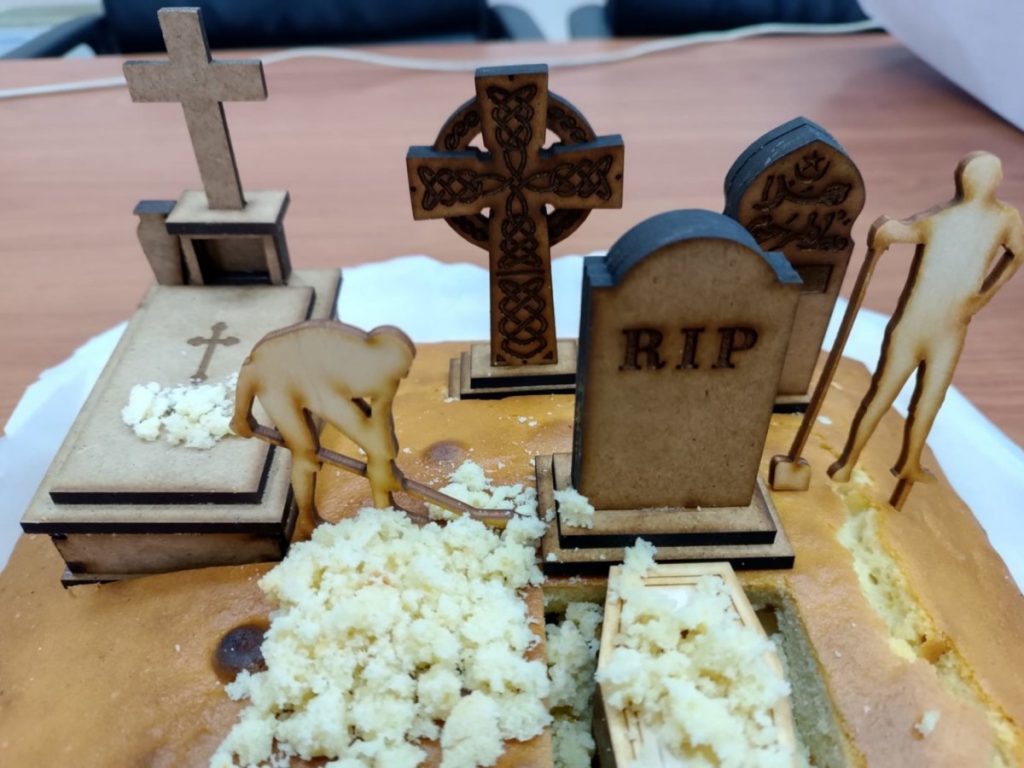 Viral έγινε, για μια ακόμη χρονιά, η πρωτοχρονιάτικη πίτα που έκοψαν οι εργαζόμενοι της Διεύθυνσης Κοιμητηρίων του Δήμου Βόλου. Η βασιλόπιτα είναι στολισμένη με μνήματα, ένα φέρετρο, νεκροθάφτες και λουλούδια, με τον προϊστάμενο της Δεύθυνσης Κοιμητηρίων του Δήμου Βόλου κ. Γιάννη Πολυμενίδη να γράφει σε ανάρτησή του στα social media: