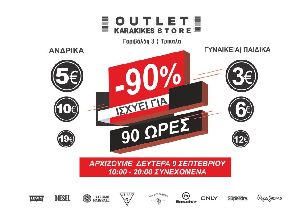 -90% ΓΙΑ 90 ώρες στο OUTLET KARAKIKES (!)ΓΑΡΙΒΑΛΔΗ 3 Τρίκαλα αρχίζουμε ΔΕΥΤΕΡΑ 9/ΣΕΠΤΕΜΒΡΙΟΥ 10-20:00 !! ΑΝΔΡΙΚΑ-ΓΥΝΑΙΚΕΙΑ-ΠΑΙΔΙΚΑ -90% 5€-10€ -15€ (!)Τα μεγαλύτερα brand ! Τώρα κάτω του κόστους!!
