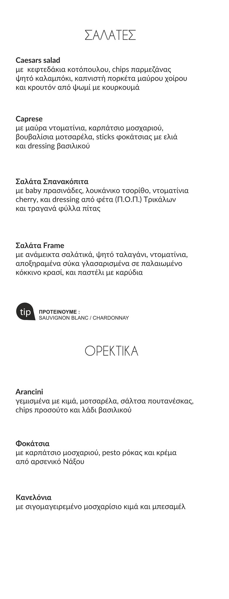 Το FRAME στην Ασκληπιού προσφέρει από το πρωί καφέ take away, ενώ από τις 2 μ.μ. και μετά ανοίγει και την κουζίνα του και μας καλεί να δοκιμάσουμε τα νέα πιάτα του καταλόγου του, προσεγμένα και μελετημένα από τους σεφ του. Και με ένα τηλεφώνημα στο 2431022902 και στο 6989584170 φτάνουν σπίτι μας. Δείτε το νέο κατάλογο του FRAME παρακάτω: