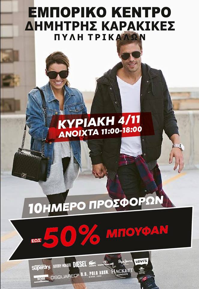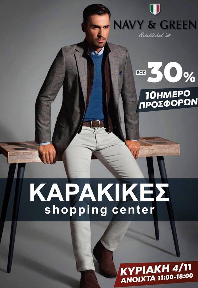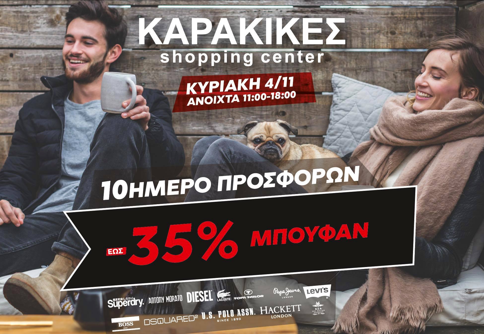 Στο ΚΑΡΑΚΙΚΕΣ Shopping Center επί της Ιουλιέτας Αδάμ θα βρούμε, πέραν όλων των άλλων, όλα τα μπουφάν με έκπτωση 35% και έκπτωση στα προϊόντα της NAVY GREEN 30%. Στο κατάστημα ΚΑΡΑΚΙΚΕΣ στη Πύλη όλο το 10ήμερο των εκπτώσεων, προσφορές έως 50% στην αρχική τιμή, σε όλα τα επώνυμα ρούχα και παπούτσια!… Καιρός για ανανέωση ενόψει χειμώνα…