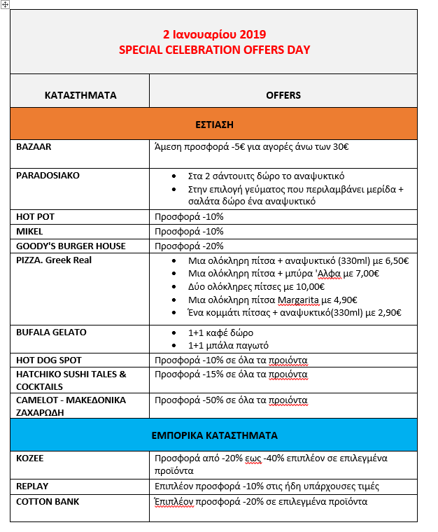 Οι ώρες λειτουργίας στις 2 Ιανουαρίου θα είναι από τις 10 το πρωί ως τις 9 το βράδυ για τα εμπορικά καταστήματα και έως τις 12 το βράδυ για τα καταστήματα εστίασης και ψυχαγωγίας.