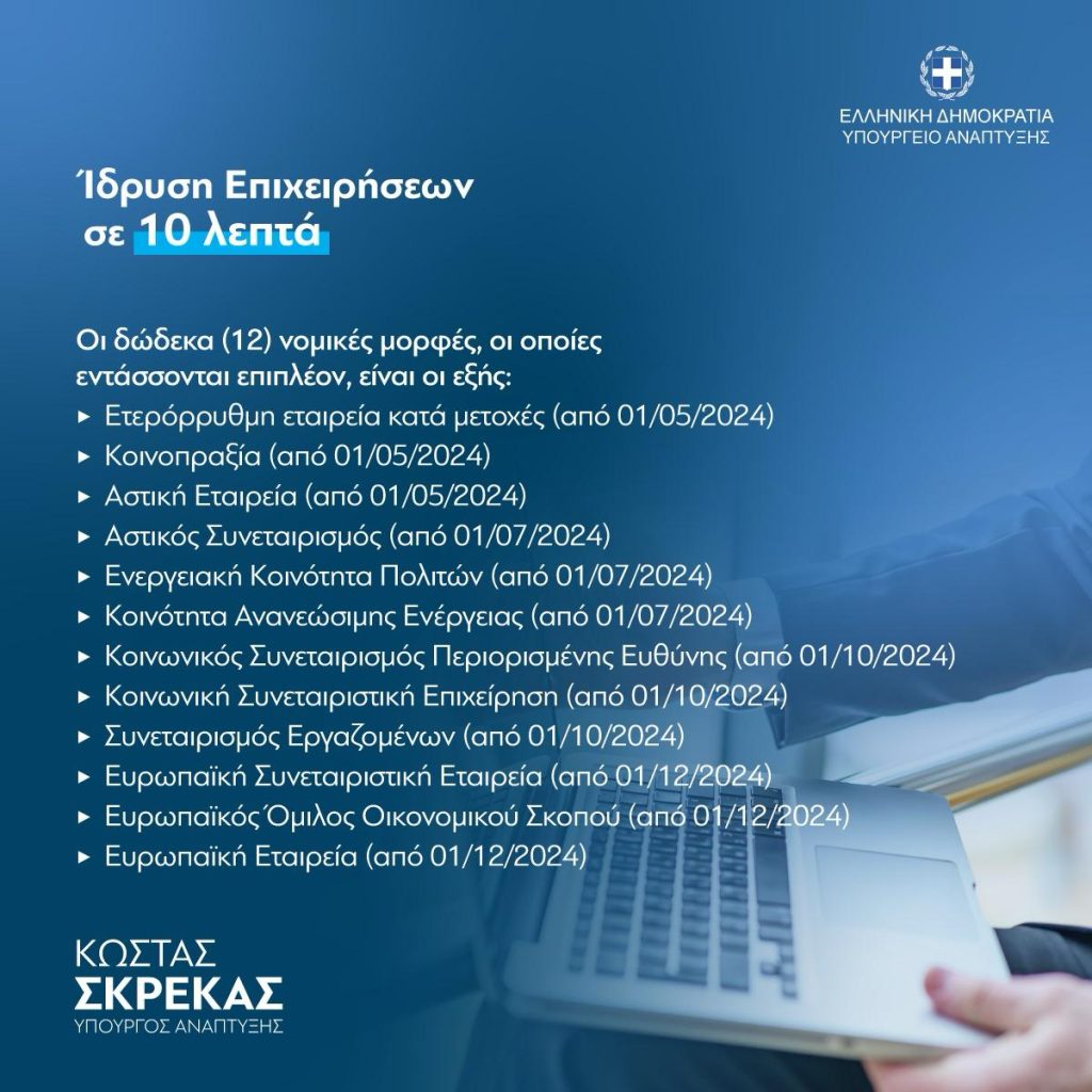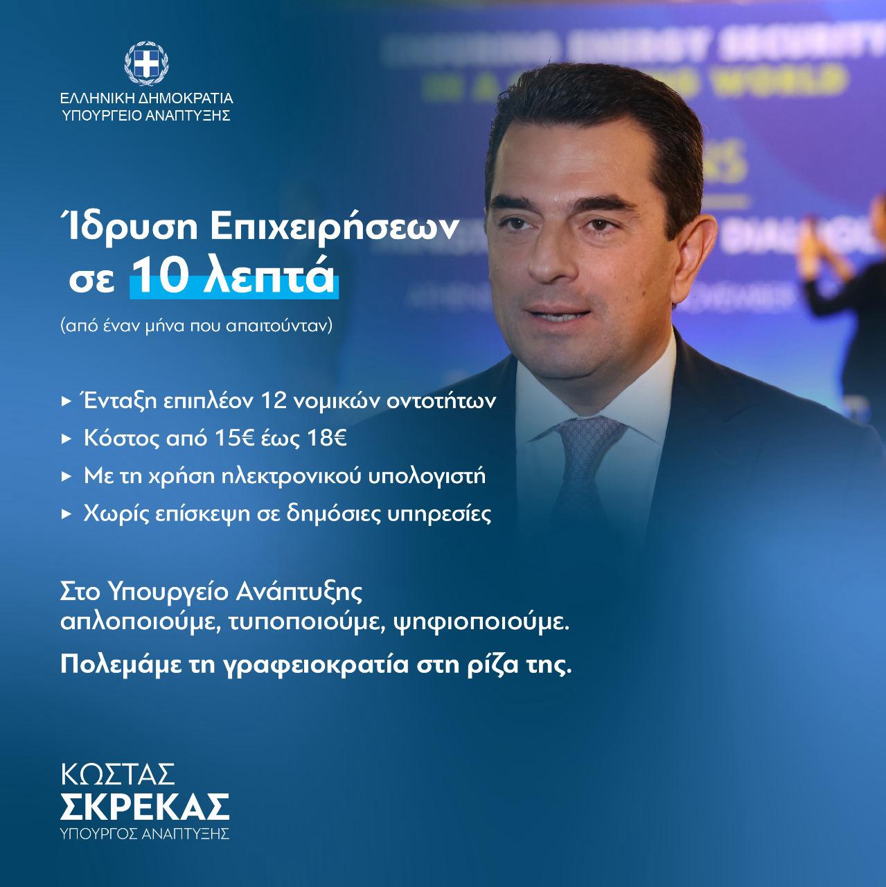 Μέσα σε ελάχιστο χρόνο που δεν θα ξεπερνά τα δέκα λεπτά, από σχεδόν ένα μήνα που απαιτείται σήμερα, θα μπορούν να ιδρύονται επιχειρήσεις επιπλέον δώδεκα διαφορετικών νομικών μορφών, με την απόφαση του Τρικαλινού Υπουργού Ανάπτυξης Κώστα Σκρέκα.