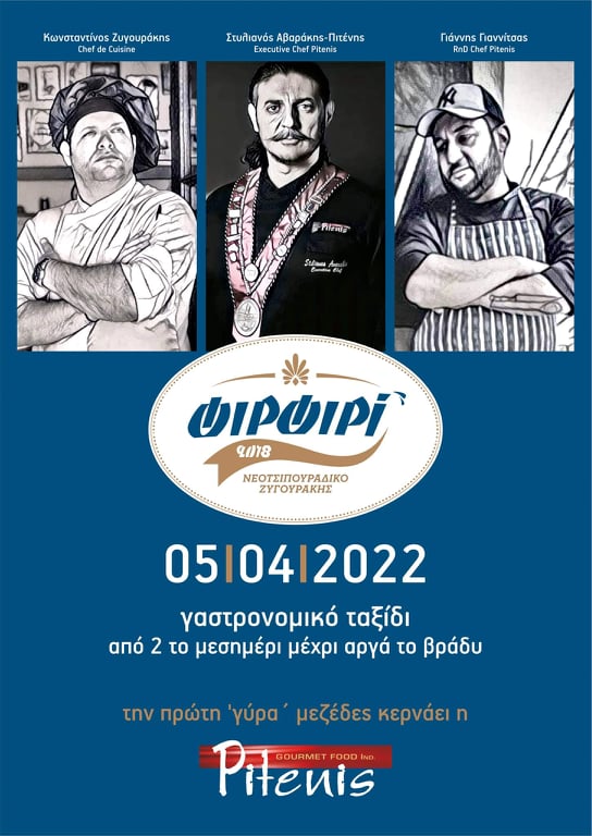 Την Τρίτη 5/4 και ώρα μετά τις 2 το μεσημέρι το ‘Φιρφιρί’ και ο Κωνσταντίνος Ζυγουράκης, υποδέχεται την Gourmet βιομηχανία τροφίμων Pitenis μαζί με τον Executive Chef Στέλιο Πιτένη και τον RnD Chef της εταιρείας Γιάννη Γιαννίτσα, σε ένα γαστρονομικό ταξίδι μέχρι αργά το βράδυ.