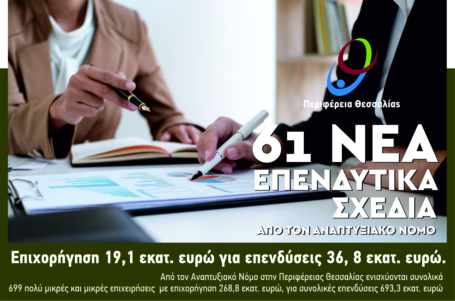 Εξήντα ένα πολύ μικρές και μικρές επιχειρήσεις στη Θεσσαλία επιχορηγούνται από τον Αναπτυξιακό Νόμο της Περιφέρειας με 19.127.716,14 ευρώ προκειμένου να υλοποιήσουν τα νέα τους επενδυτικά σχέδια συνολικού προϋπολογισμού επένδυσης 36.836.174,90 ευρώ.