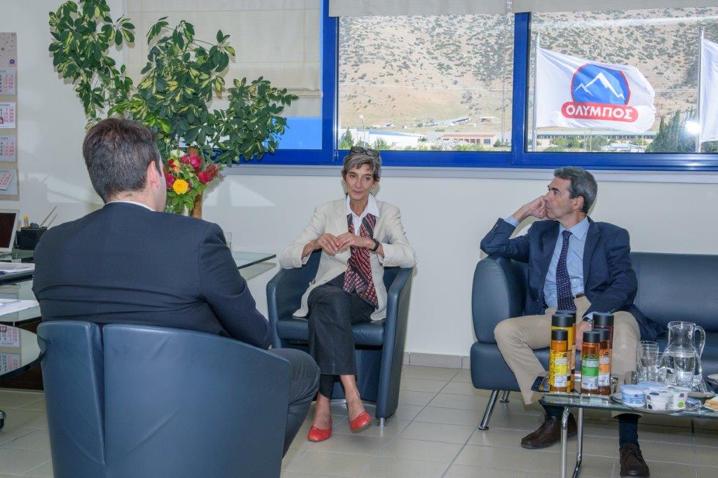 Την Βρετανή διπλωμάτη, που κέρδισε τις εντυπώσεις με τη βαθιά γνώση της Ελληνικής πραγματικότητας και τα άπταιστα Ελληνικά της, υποδέχτηκαν και ξενάγησαν στις εγκαταστάσεις της ΟΛΥΜΠΟΣ εκ μέρους της διοίκησης ο Στέλιος Μ. Σαράντης με τον διευθυντή του εργοστασίου Μιχάλη Κανταρτζή.