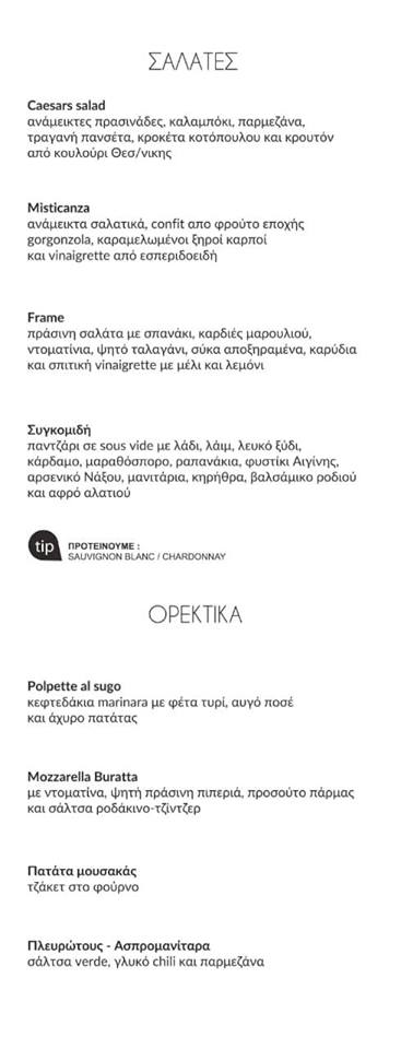 Για μια ακόμη σεζόν το FRAME Bar-Restaurant έρχεται και μας προσφέρει ξεχωριστά πιάτα. Ο σεφ εμπνέεται από τις πρώτες ύλες της εποχής και δημιουργεί εξαιρετικά πιάτα, υπογράφοντας την εξέλιξη στην παραδοσιακή κουζίνα. Δείτε τον κατάλογο παρακάτω