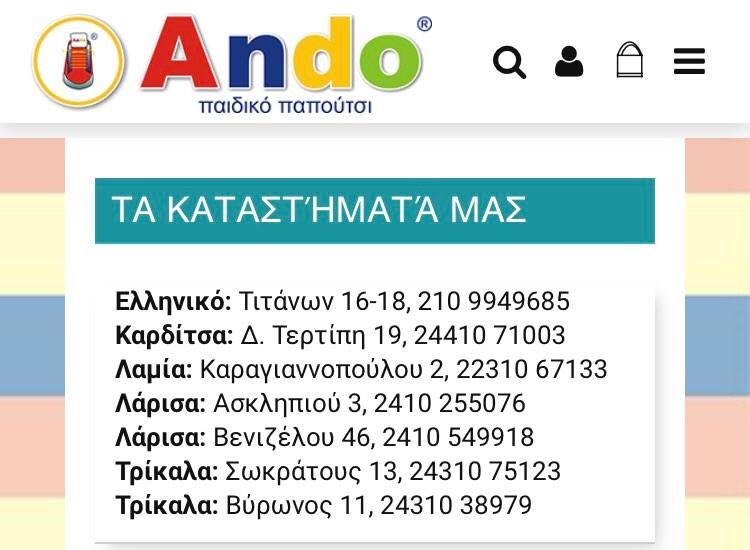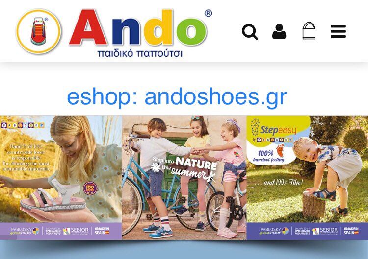 Για ηλεκτρονικές αγορές , στο ηλεκτρονικό καταστήματα της εταιρίας www.andoshoes.gr θα δείτε όλη την ποικιλία των σχεδίων και πολλές προσφορές . Η εταιρία Ando shoes με έδρα την πόλη μας , τα Τρίκαλα , δραστηριοποιείται σε όλη την Ελλάδα με δικά της καταστήματα και με συνεργασίες των εταιριών που αντιπροσωπεύει.