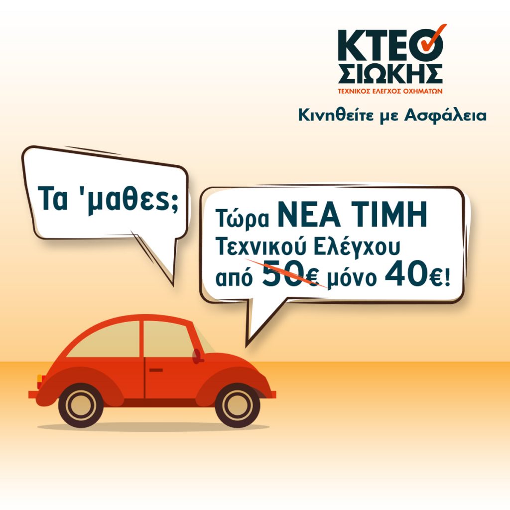 Έτσι επιστρέφοντας από τις διακοπές και εφόσον είμαστε υποχρεωμένοι να περάσουμε από τεχνικό έλεγχο το αυτοκίνητό μας πλέον η τιμή διαμορφώνεται από τα 50 € στα 40 €, για να μπορούν όλοι, σ’ αυτές τις δύσκολες εποχές να ανταποκριθούν.
