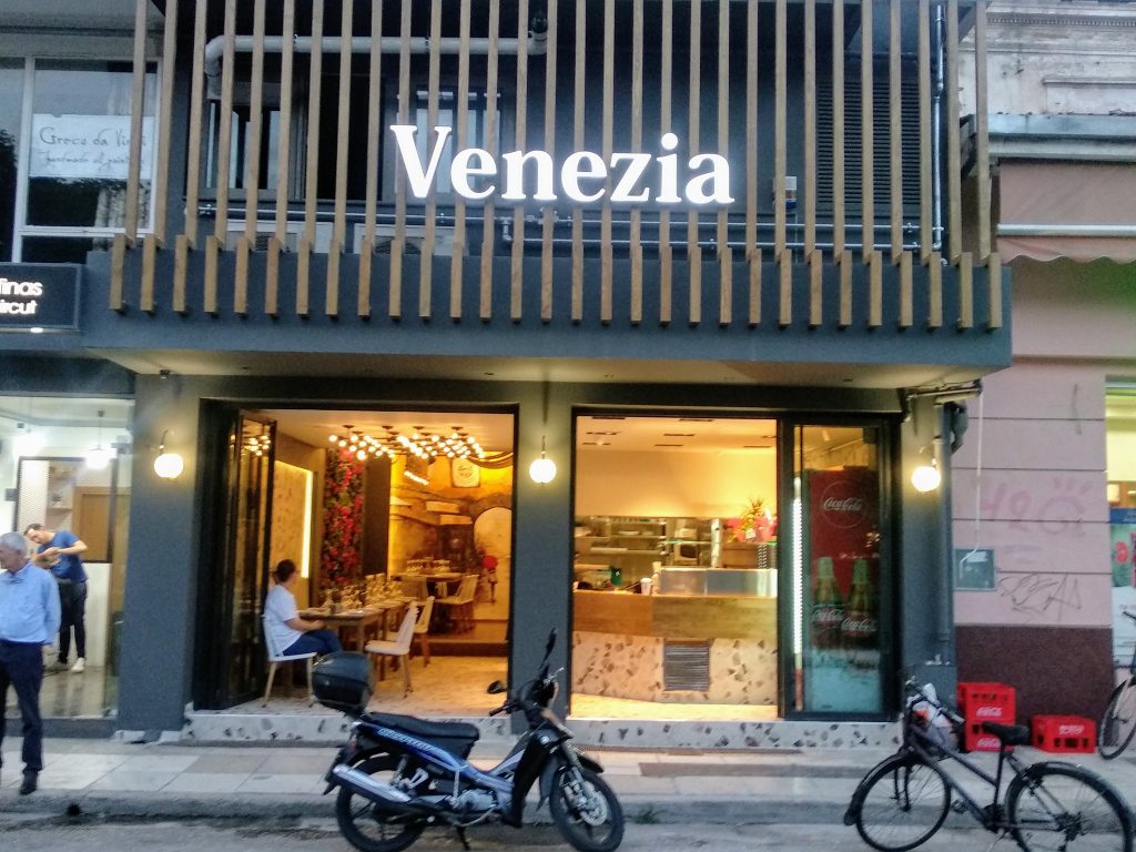Η Venezia, με αναφορά στην γνήσια Ιταλική κουζίνα, υλοποιήθηκε δια χειρός… Τζίνας Μπέη. Όπως η ίδια η αρχιτέκτονας εσωτερικού χώρου αναφέρει «κεντρική ιδέα βασίστηκε στον συνδυασμό του μωσαϊκού με το ξύλο, το μέταλλο και τον καθρέφτη, εναρμονισμένα άψογα στο φυσικό περιβάλλον δημιουργώντας ένα διαχρονικό αποτέλεσμα σε βενετσιάνικο στυλ…».