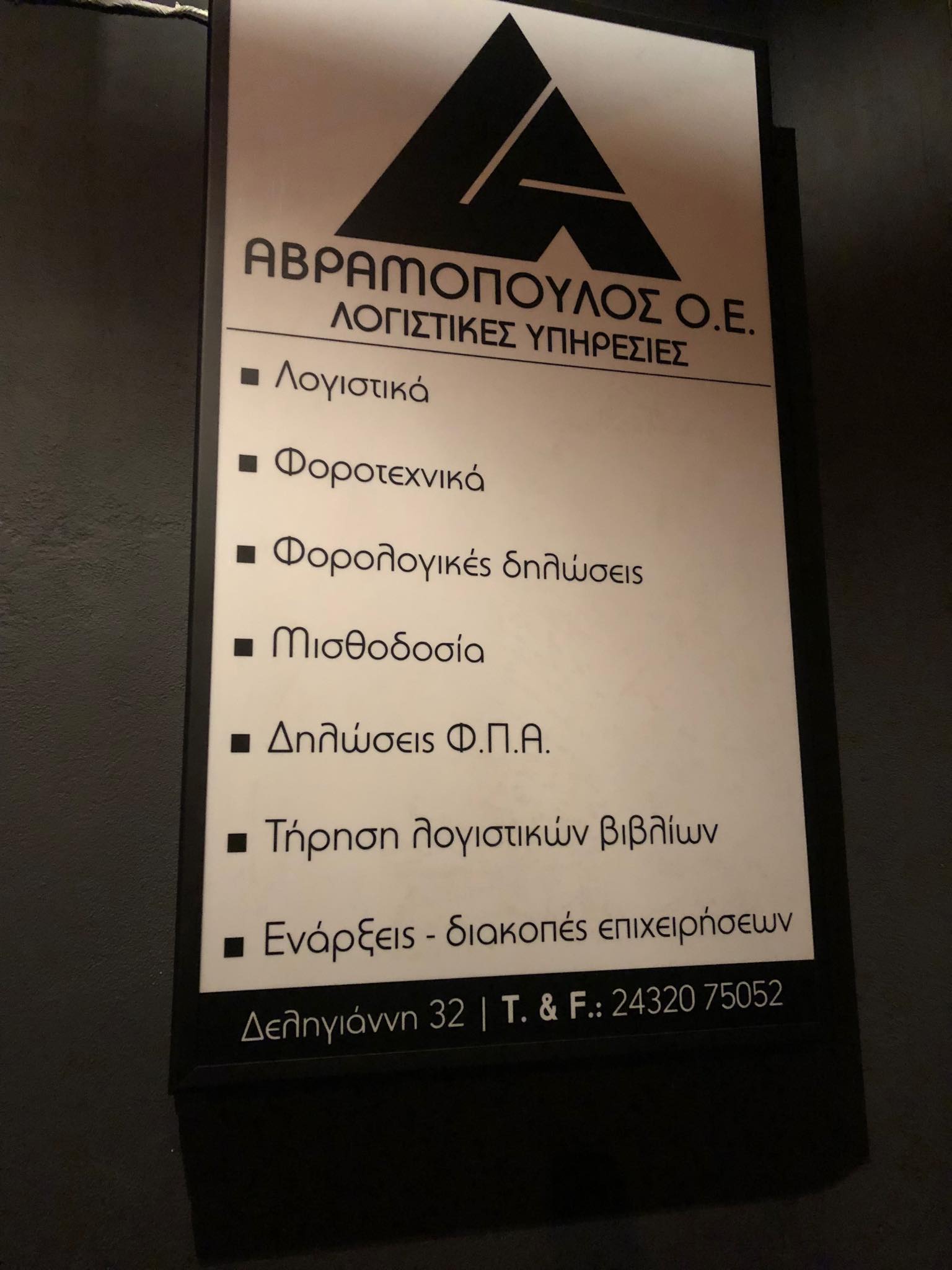 Πρόκειται για το λογιστικό γραφείο «Αβραμόπουλος Ο.Ε.» το οποίο διευθύνει ο γνωστός νεαρός οικονομολόγος Λευτέρης Αβραμόπουλος. Προσφέρει πολλαπλές λύσεις σε θέματα λογιστικά, φοροτεχνικά, φορολογικές δηλώσεις, μισθοδοσία, δηλώσεις Φ.Π.Α., τήρηση λογιστικών βιβλίων, ενάρξεις-διακοπές επιχειρήσεων, καθώς και χρήσιμες συμβουλές για όλα τα επίπεδα των επιχειρήσεων.